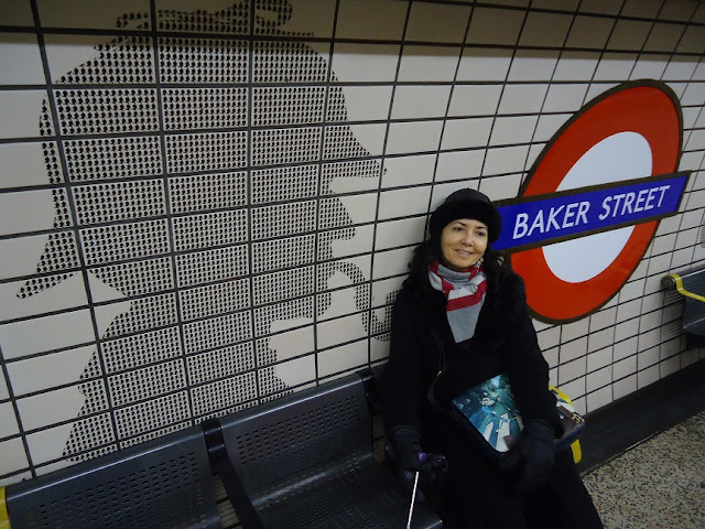 então, no livro de conan doyle, sherlock holmes mora em baker street, no número 221a. esse número não existe na rua, claro. e é claro que eu não iria na baker street para não ver um número que não existe. mas passando pela estação baker street do underground, vimos que uma das plataformas é toda enfeitadinha com o perfil de sherlock holmes. mas tem uma outra plataforma que é muito mais antiga e parecendo coisa de filme antigo de terror ou de suspense.