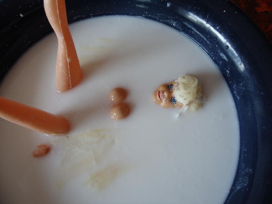 A partir desse interesse, produzi agora a minha própria e primeira representação dessa deusa do leite, na qual a deusa se banha, submerge, se afoga, se alimenta do excesso de seu líquido doado. O trabalho é composto por um grupo de fotos que registra a ação de molhar e manipular a deusa em seu leite. Como pretendo fazer outros trabalhos dentro do tema, chamei essa sequência de fotos de "Nossa senhora do leite n° 1". Para ver todas as fotos que compõem o trabalho, clique aqui.